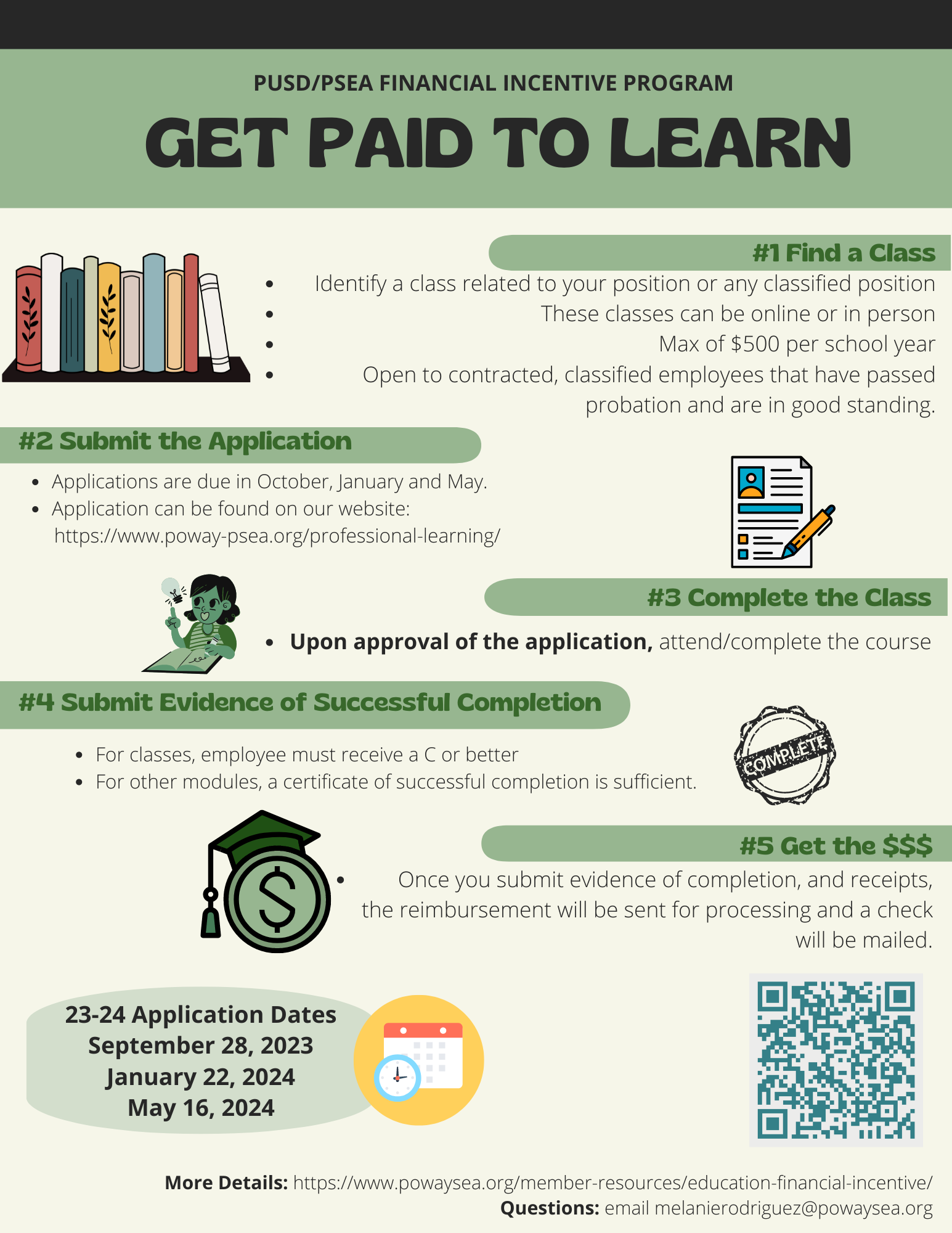 The Education Financial Incentive Program is a negotiated agreement between the Poway Unified School District (District) and Poway School Employees Association (PSEA). (See, Article 14.18 of the PSEA bargaining agreement). Financial incentive support is available to all bargaining unit members who meet the guidelines listed below. This program is designed to promote and encourage classified professional development opportunities that fall both within and outside the employee’s regular workday. A District Education Financial Incentive Program Committee (Committee) has been established to oversee the applicant process.